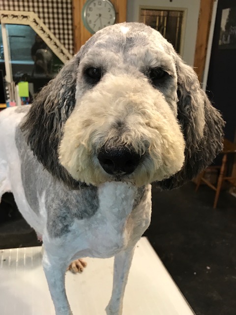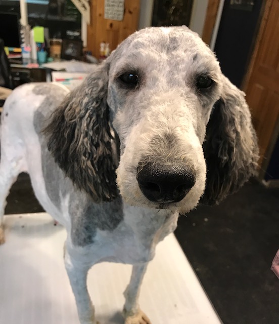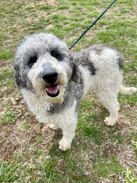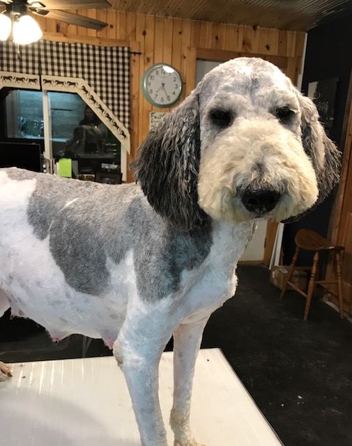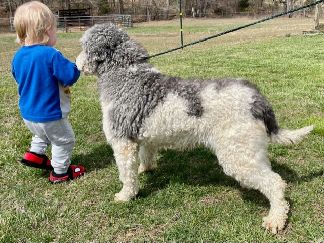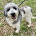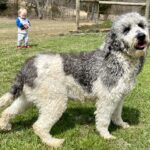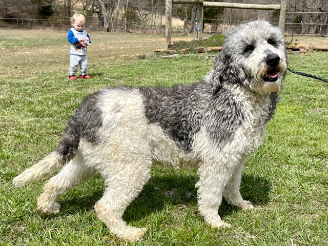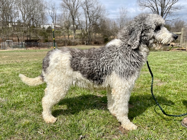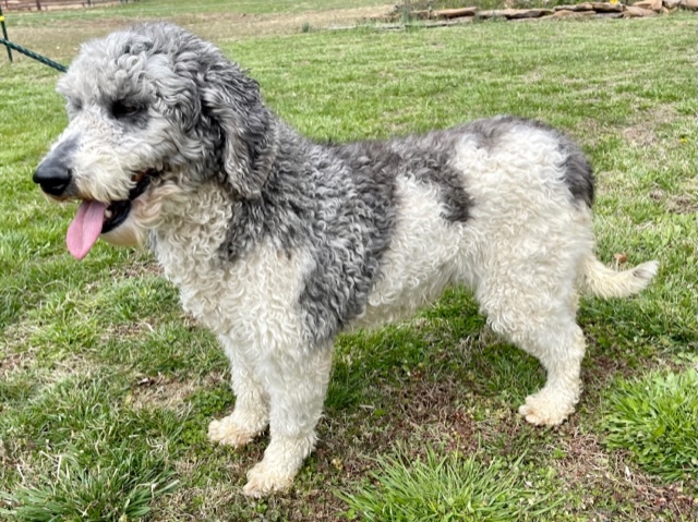 DeeDee is a black and white Parti (it means she has spots) German Shepaussidoodle. She has the best temperament and is super sweet!! She stands 24 inches @ her shoulder, she weighs 50 pounds. She is an AWESOME blend of Australian Shepherd Dog, GSD, and Standard Poodle, she does NOT shed! DeeDee has a wonderful temperament, she is solid, not flighty, non aggressive, sweet natured, and above all intelligent! DeeDee is a proven producer, her kids make wonderful family members, excellent Service Dogs.