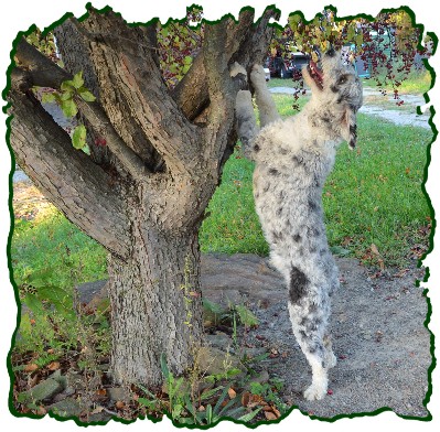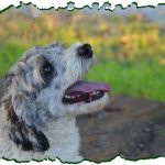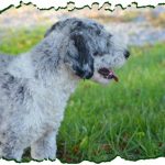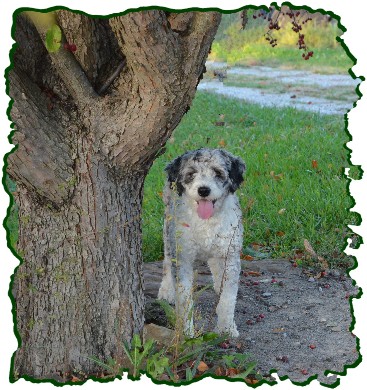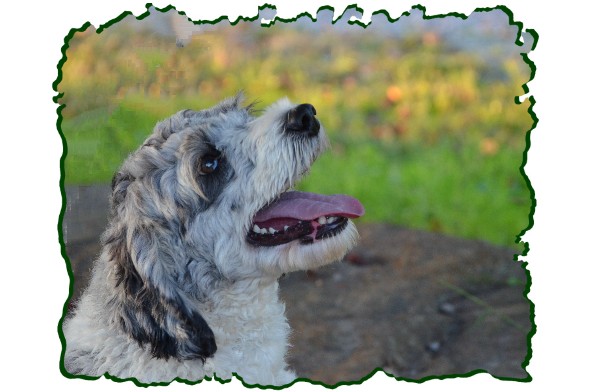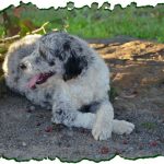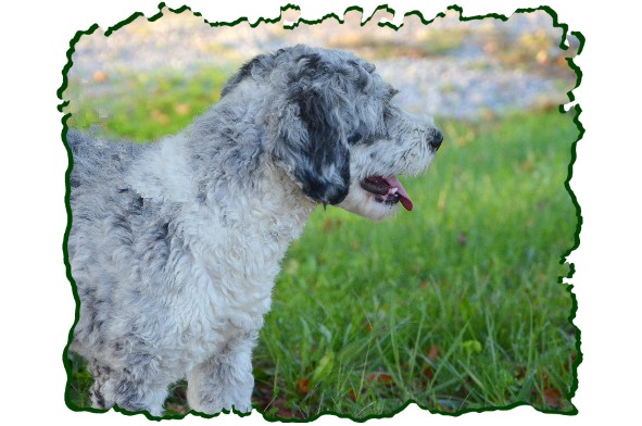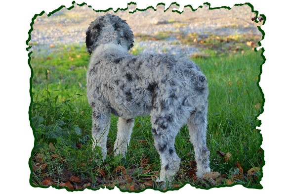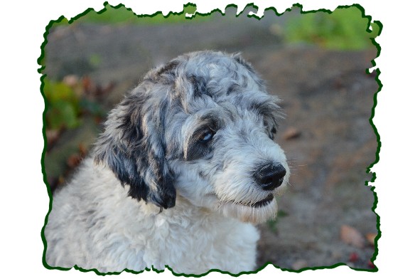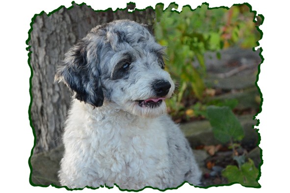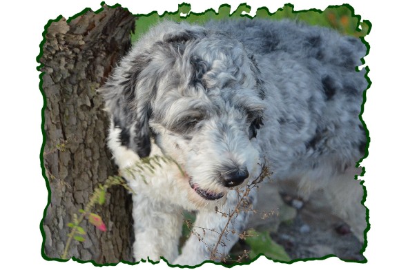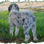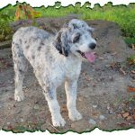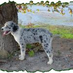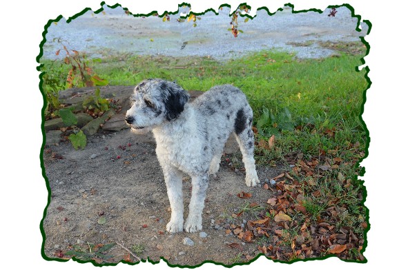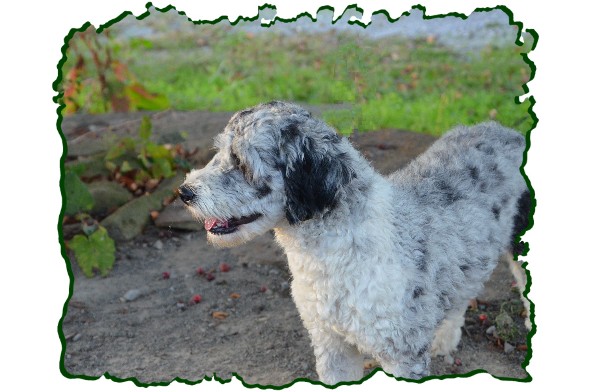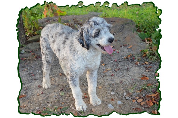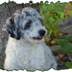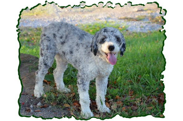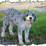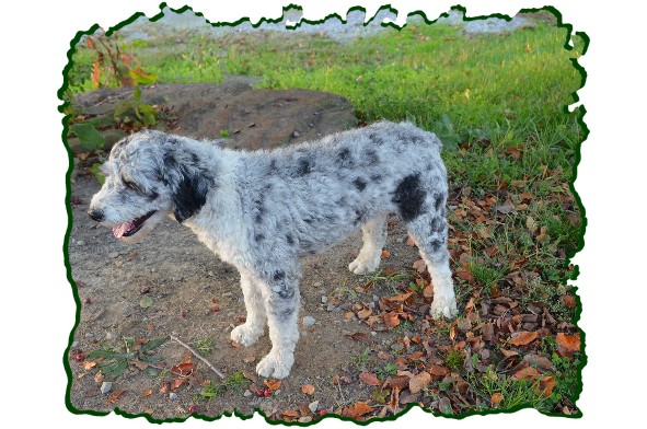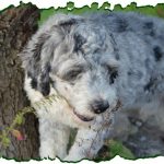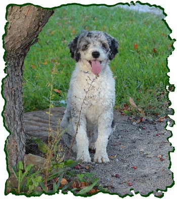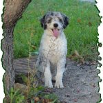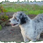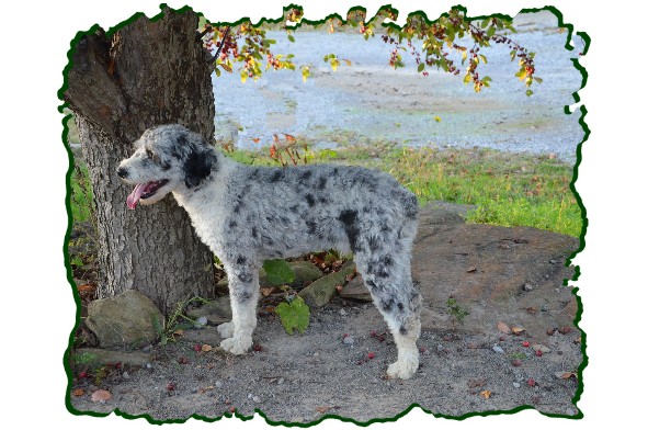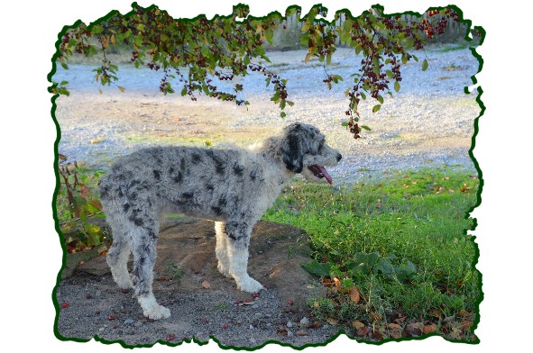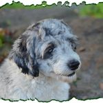Double R Pretzel is a blue merle miniature multigen.  This very handsome “Stud Muffin” has a tip top  personality…he’s sweet, funny, very friendly…he’s the real deal!  Pretzel stands 16 inches at the shoulder, he weighs 25 pounds.  He has a blue chip in one eye…and a wonderful non shedding hair coat.  Pretzel is the son of Double R Google x Nicholas Cage…he looks, acts, and apparently reproduces just like his dad…like Father like Son!  This “apple” didn’t fall far from the tree…we are very proud of Pretz!