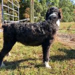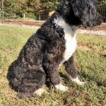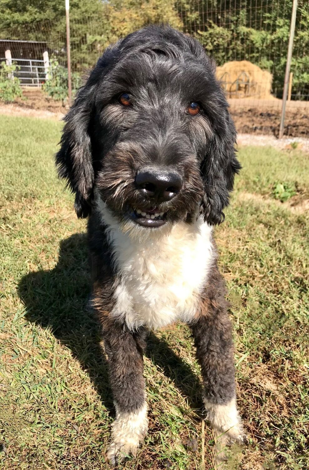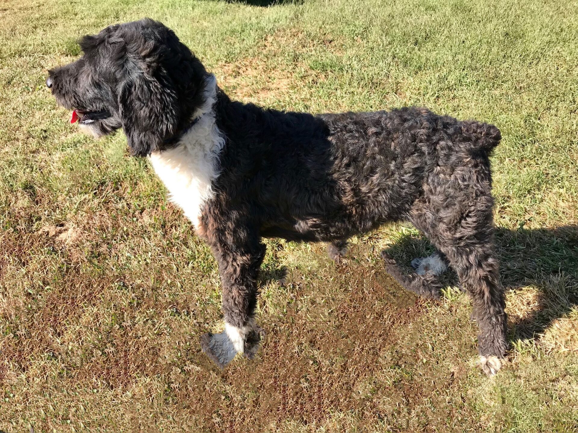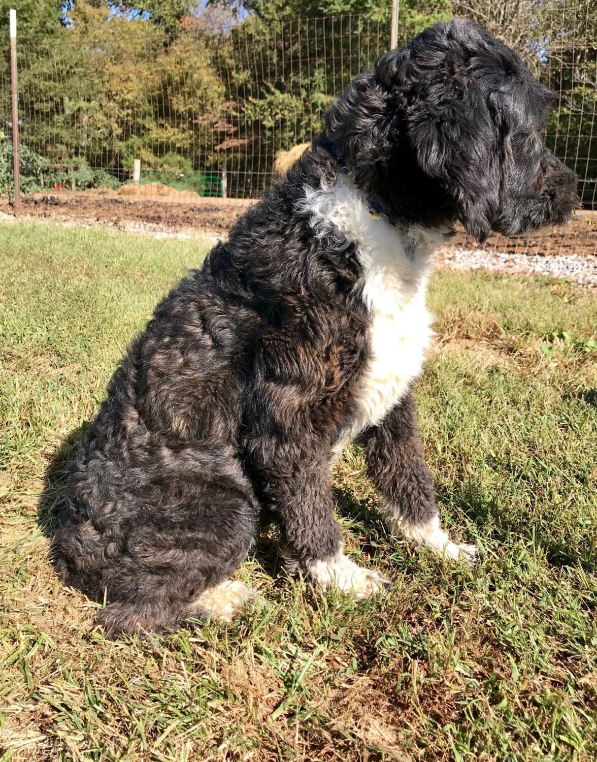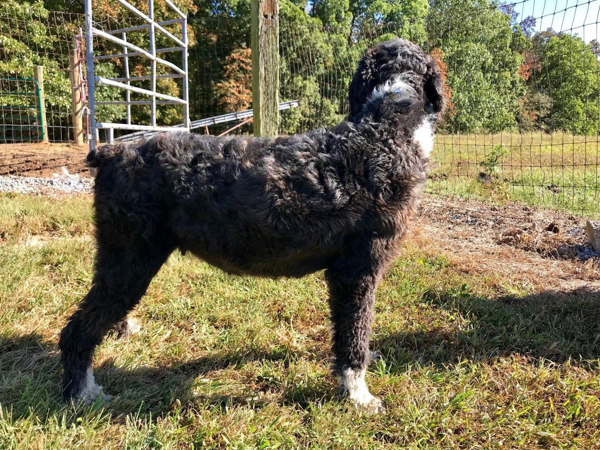 Storm is an F2 Aussiedoodle female. She is a moyen and can breed up or down in size since she is 17 inches tall and 30 pounds. Storm is a beautiful black and white with an almost full white collar. She is well made with excellent confirmation and good bone…just like her parents and grand parents! We are excited to see what Storm will contribute to the gene pool.