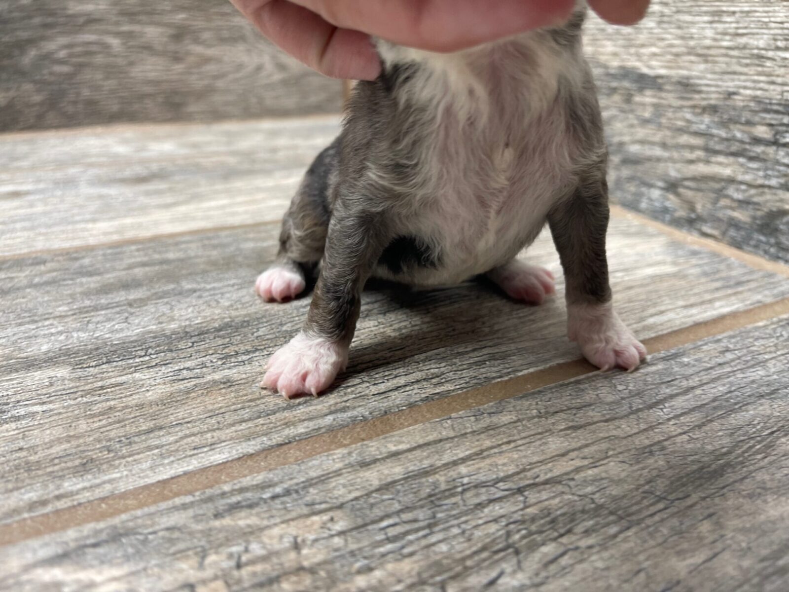 PNBLUMF2- perfect blue merle female with all of the white trim and copper to boot! She is as pretty as they come! These puppies come with a 2 year health guarantee, health record listing vaccines/dewormers, registration papers, and are examined by the vet and issued a health certificate before they leave. These babies are hypoallergenic and little to no shedding. They are bred with wonderful temperaments and are doggy door trained to potty outside so house training is a breeze! My 4 yr old son “helps” and plays with the puppies so they are exposed to children. If you are wanting one of these pups we sometimes make a delivery route to STL or 2 hours from the house depending on customer locations and amount of pups heading that direction so we can set up a meeting route with a small fee if that ends up working for everyone. We offer airline shipping or flight nanny just need to see on quotes and shipping time frame. We are a small family business as well as a state licensed and inspected kennel. Thank you so much for supporting us! Welcome to the Double R Family!